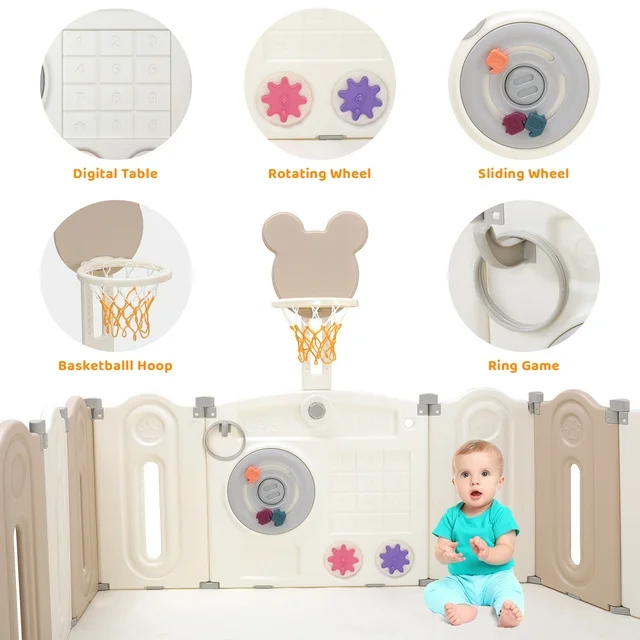 • 【Educational Toys Panel】The gate panel of playpen is designed to stimulate your child's development and creativity. With rotating wheels, a ball hoop, 3 rings and a digital table, it offers a range of activities that enhance hand-eye coordination, promote bone development, and cognitive skills.