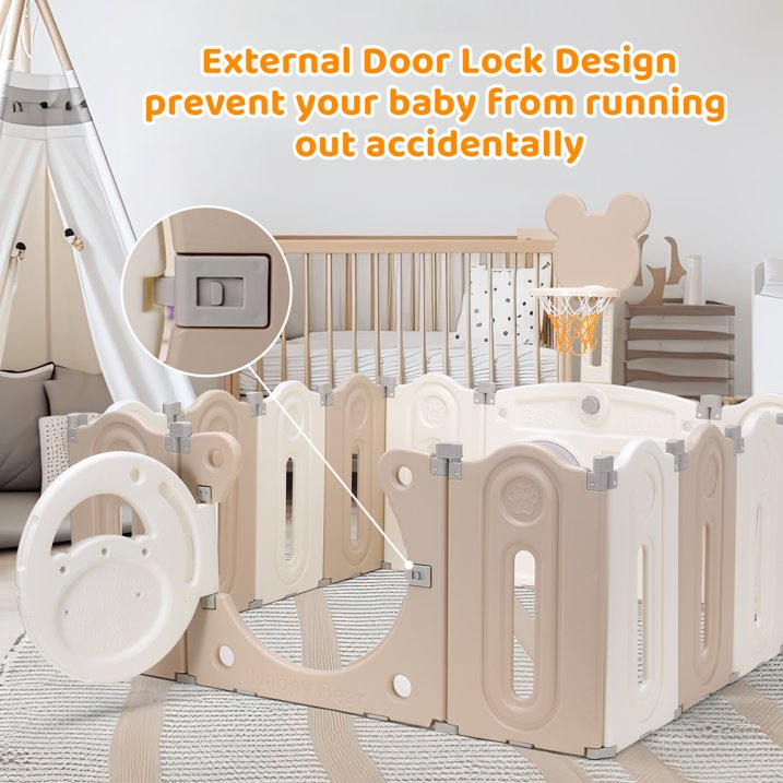 Pirecart 14-Panel Foldable Baby Playpen, Unisex Kids Playard Center with Game Panel & Lock Door