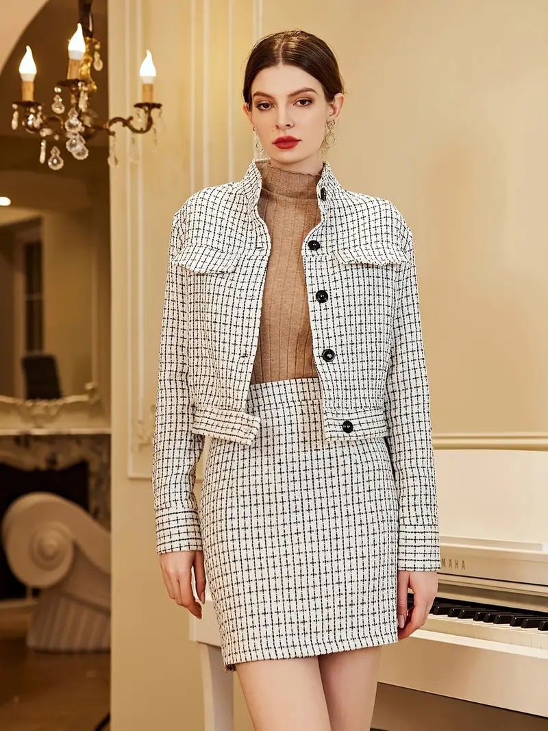 plaid button textured blazer open front long sleeve suit jacket with wide lapels elegant stylish tops for office work womens clothing outerwear details 0
