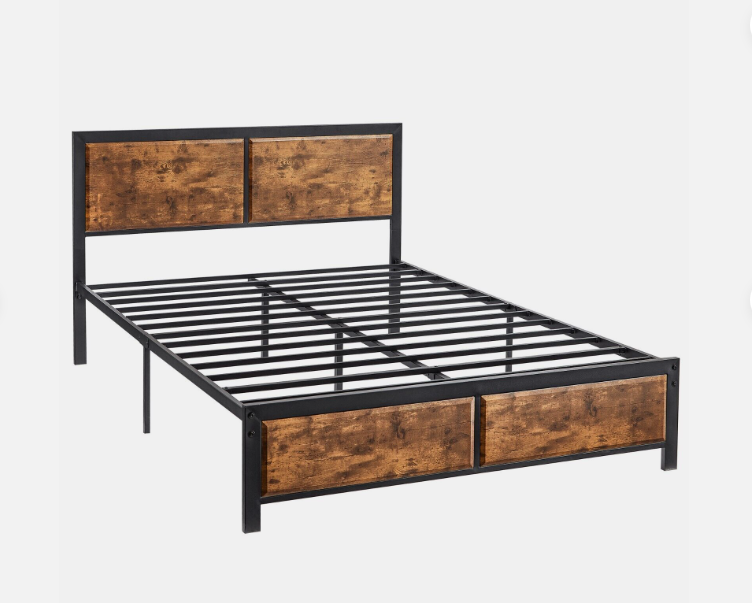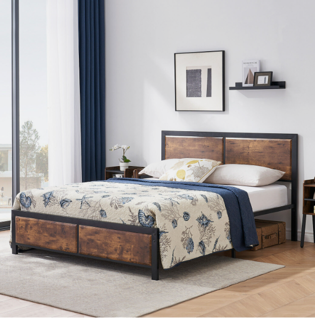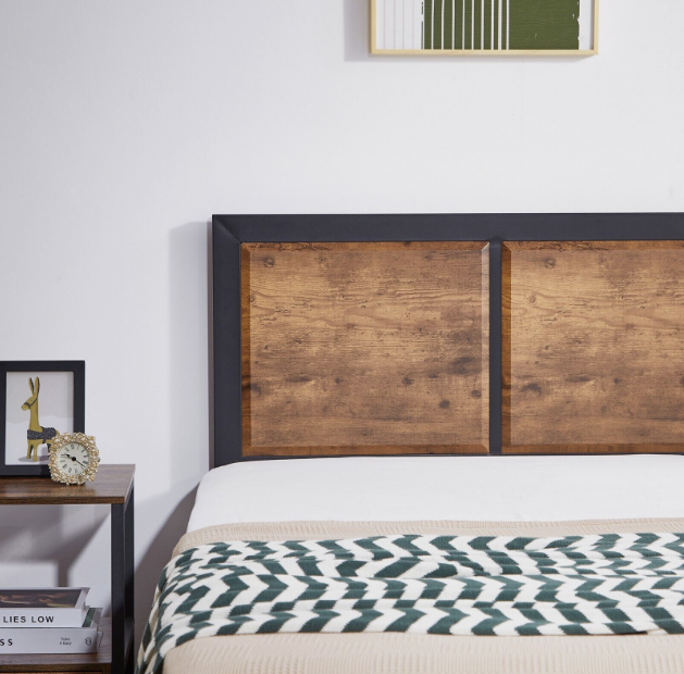 ² Sturdy and Stable】This bed frame is composed of 9 legs and 14 pieces of heavy-duty steel slats, the unique industrial wood grain headboard and footboard add better support to your mattress.