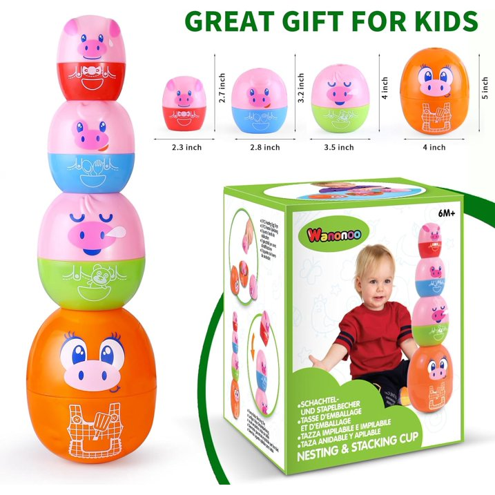 Piggy Stacking Toys from Wanonoo specially designed for toddlers aged 1-3 years old, Baby Stacking Cups for 6-12 Months helps to foster curiosity, gives an initial understanding of problem solving and helps babies to build strong fine and gross motor skills as well as hand-eye coordination. It also promotes parent-child bonding during play. Piggy stacking toys are easy to store, not only help baby develop a good habit of organizing toys after play, but also easy to carry when playing outdoors or traveling. The best gift that will not disappoint you and your child.